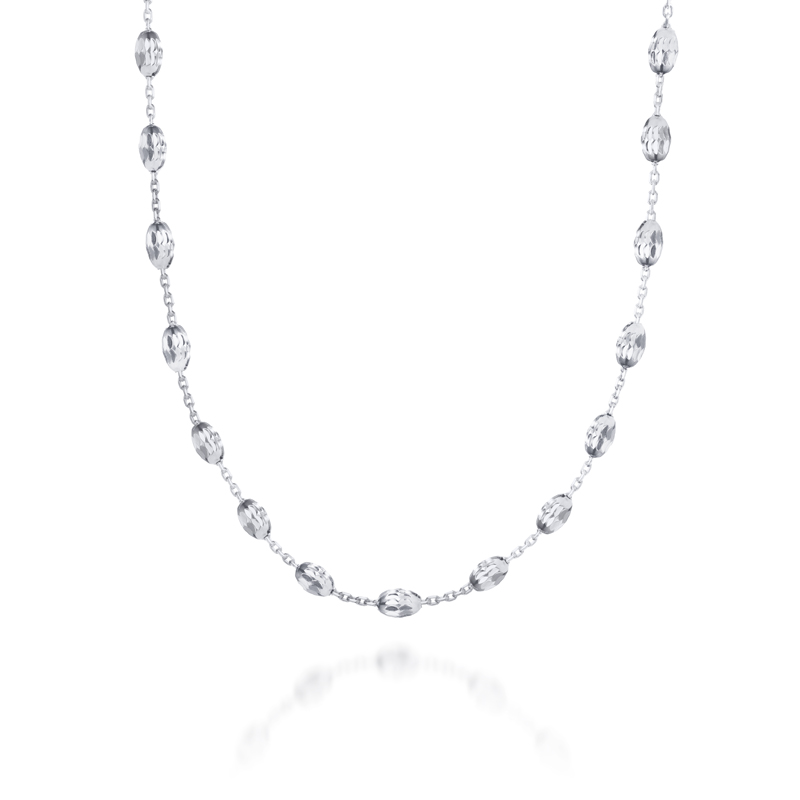 A sparkling sterling silver diamond cut trace chain with diamond cut beads. The necklace is 20 inches long.